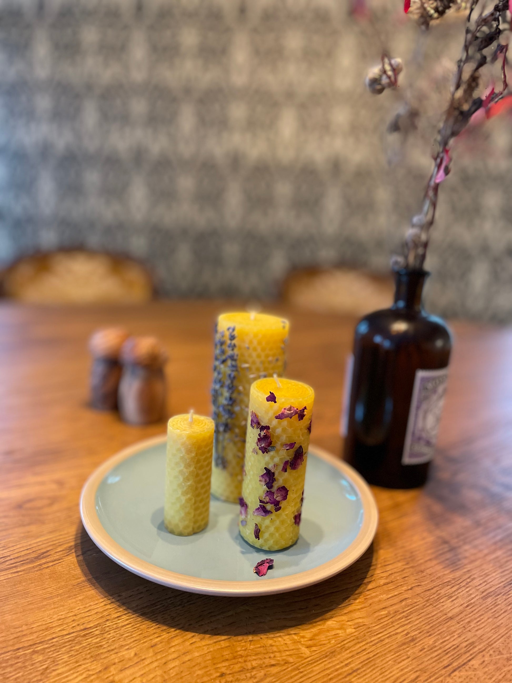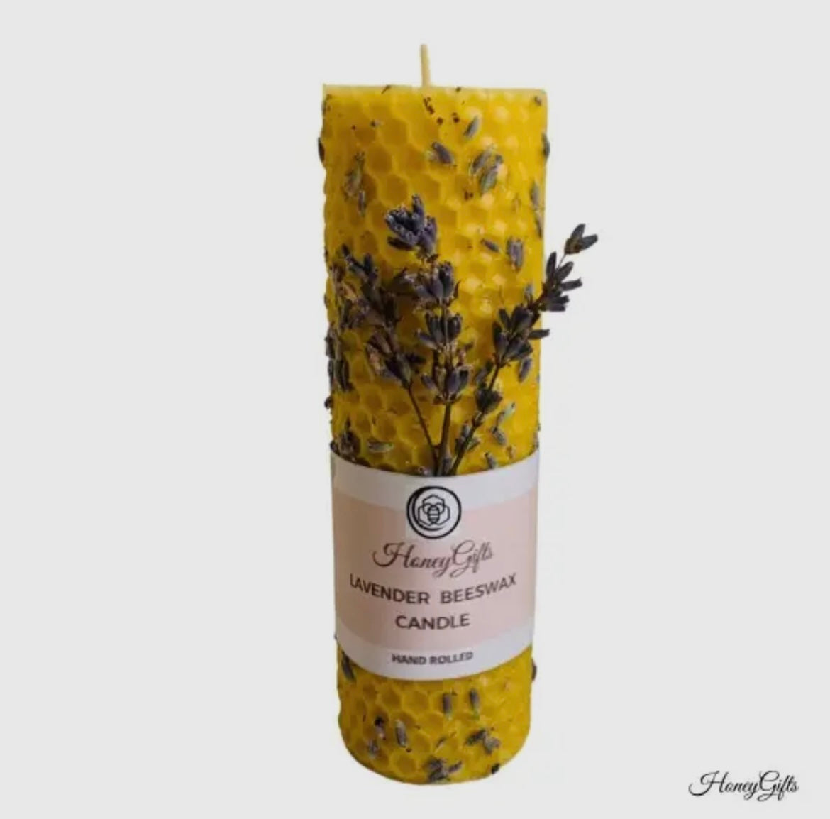 Handgjorda blockljus av 100% naturligt bivax och lavendelblommor samt eterisk bergslavendelolja. Höjd 13 cm, bredd 4 cm.