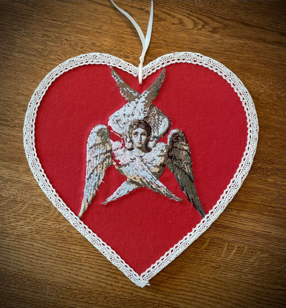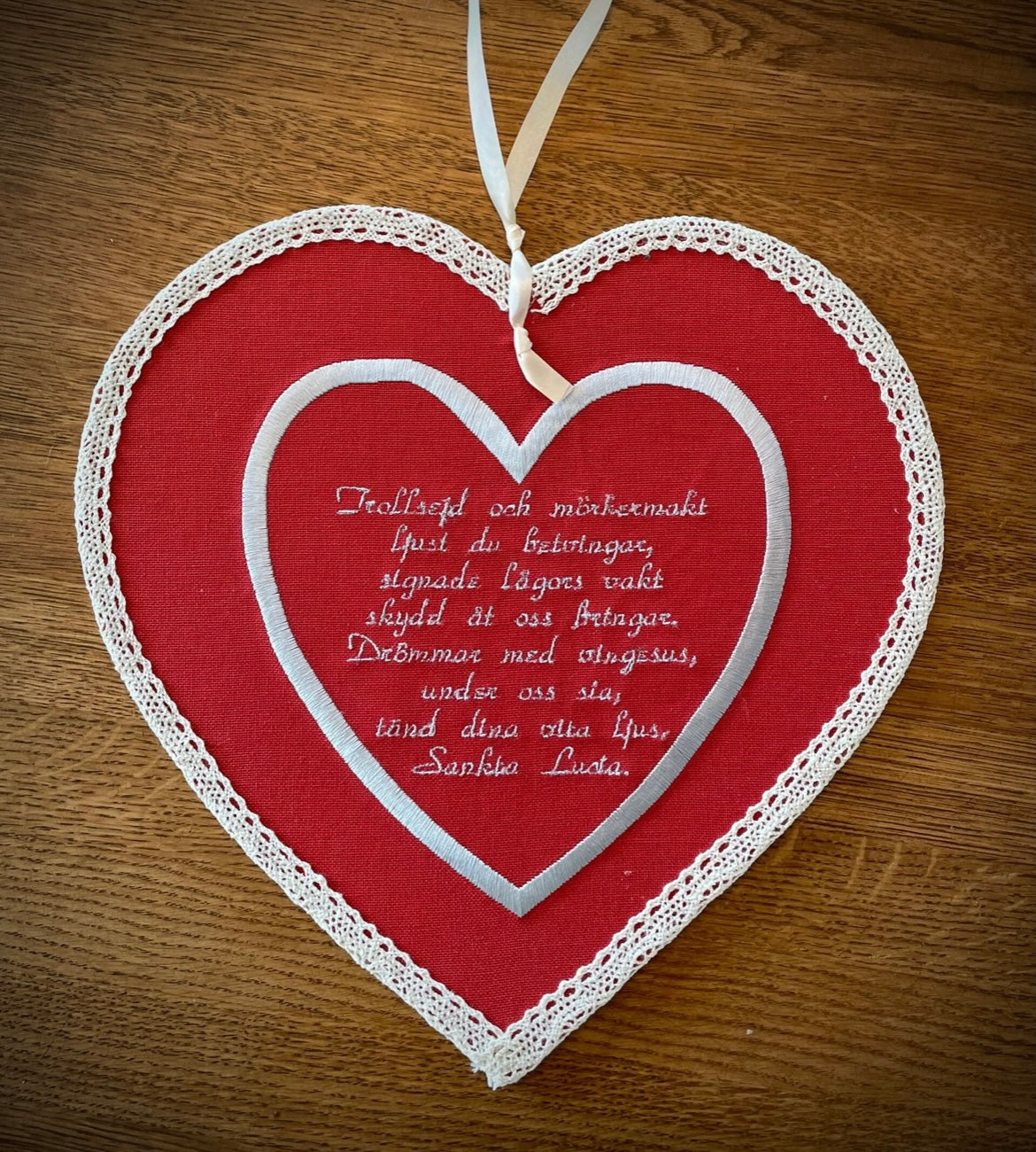 Handgjord fönsterdekoration som med sitt äldre änglamotiv blir en fin och unik detalj i hemmet under julen. På baksidan är en vers ur julsången "Sankta Lucia" av Sigrid Elmblad broderad. Mått ca 30 x 29,5 cm.