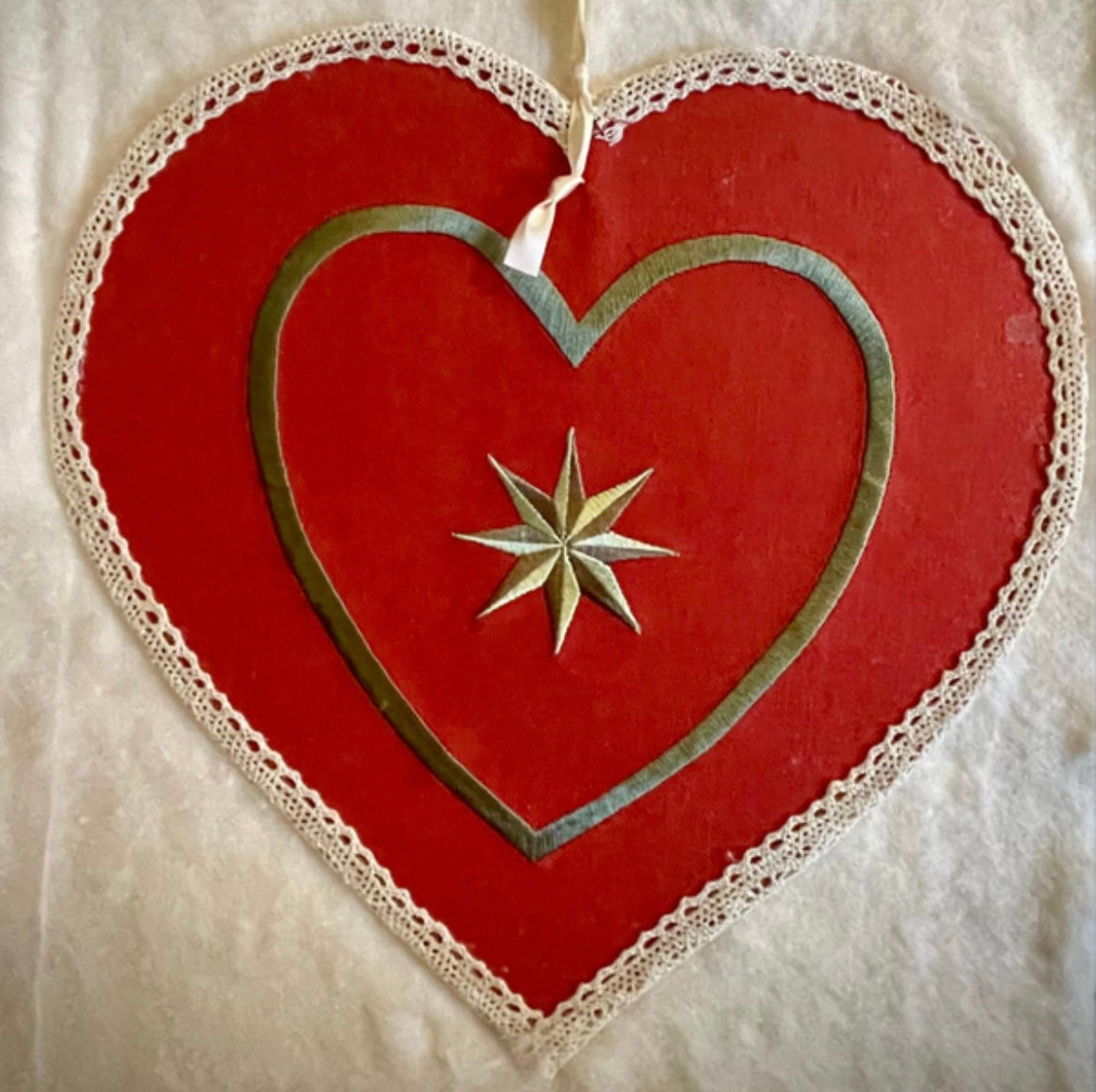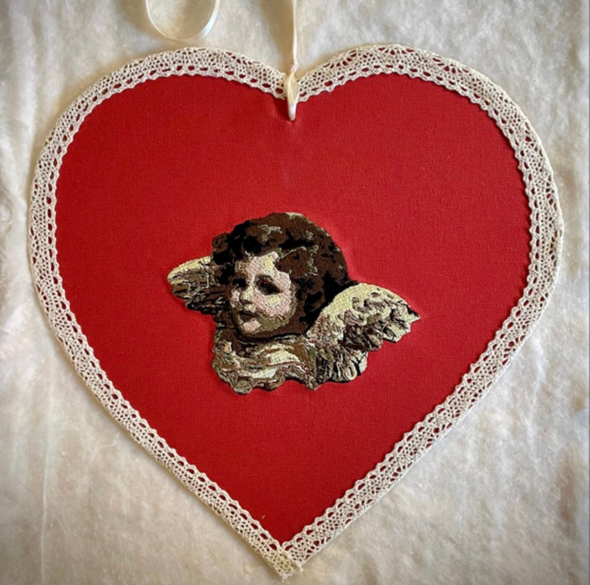Handgjord fönsterdekoration som med sitt änglamotiv blir en fin och unik detalj i hemmet under julen. På baksidan är en julstjärna och ett hjärta broderat.