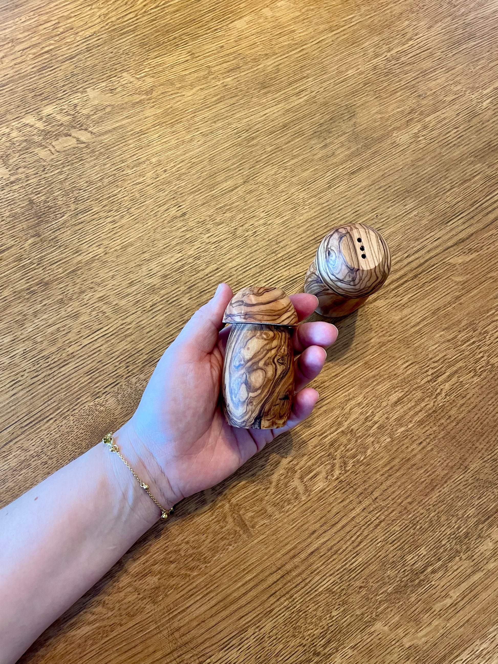 Handgjorda svampformade salt- och pepparkar av olivträ, 4 x 4 x 8,5 cm. Varje objekt är unikt och skiljer sig åt i storlek, form och ådring på träet. Uppsättning om 2.