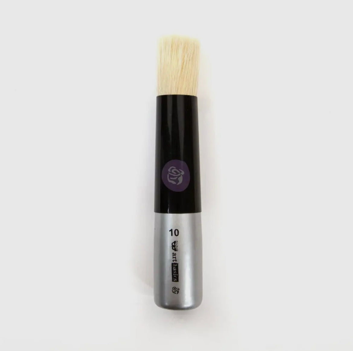 Platt rund borste med kort handtag i trä som bland annat passar bra för applicering av färg genom stenciler. Funkar fint med akrylfärger, texturpastor och andra konstmedier.
